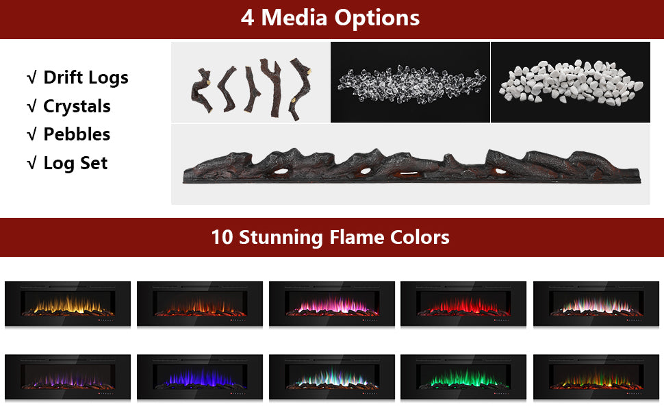 The fireplace has 10 colors that can be adjusted, solid color or mixed color. And come with 4 Media Decoration: log set, drift logs, crystals and pebbles.